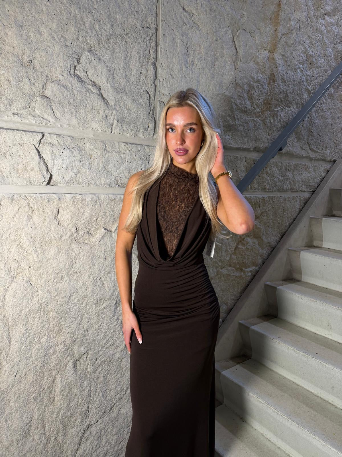 De Jara Dress Brown is een echte eyecatcher. De luxe bruine kleur in combinatie met de zachte, aansluitende stof zorgt voor een elegante look waar je mee opvalt zonder moeite te doen. Perfect voor gelegenheden waar je net dat beetje extra wilt stralen.